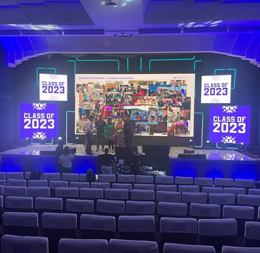 Matériel audiovisuel : Écrans LED, projecteurs HD, enceintes acoustiques, micros sans fil.